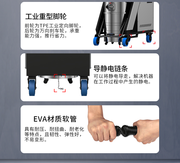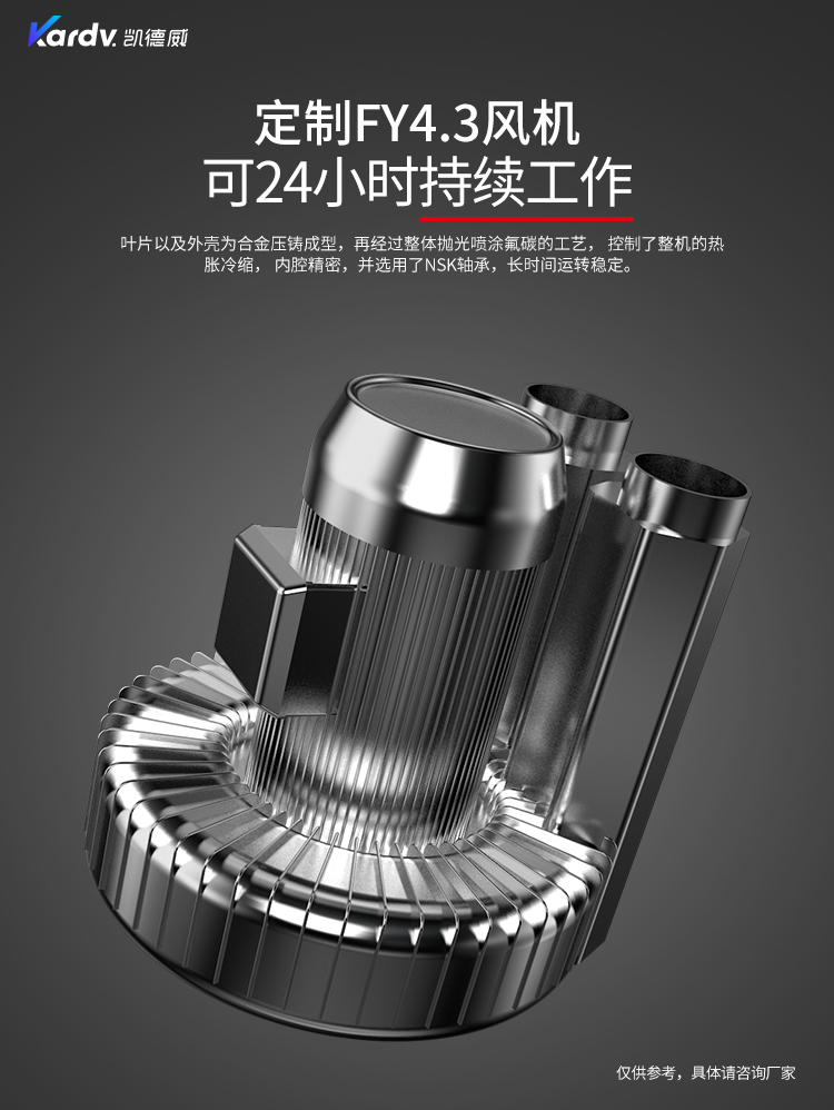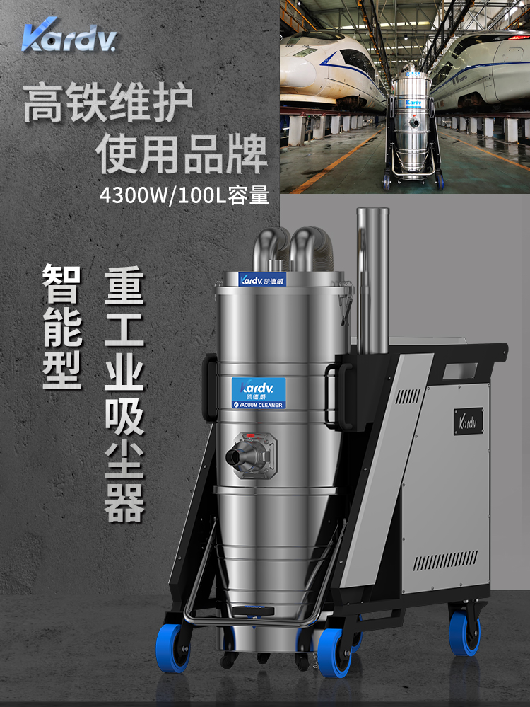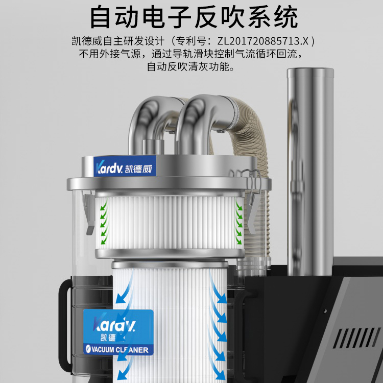 SK - F系列是我司自主研發的智能型工業吸塵器。具有以下六大亮點: A.整機采用工業設計風格,外形剛勁有力,做工精良美觀。 B.集塵桶固定把手設計。C.采用直徑160mm的TPE靜音前后大輪 D.電控系統采用凱德威自主設計帶有液晶顯示屏的智能PLC電控控制系統 E.動力源采用凱德威FY系列定制主機,并選用NSK耐高溫防塵軸承。 F.全自動電子反吹清灰系統具有人工免保養,吸力強勁、穩定,故障率低。 G.集塵系統采用100L不銹鋼材質的上下分離桶,桶壁光滑易清理。