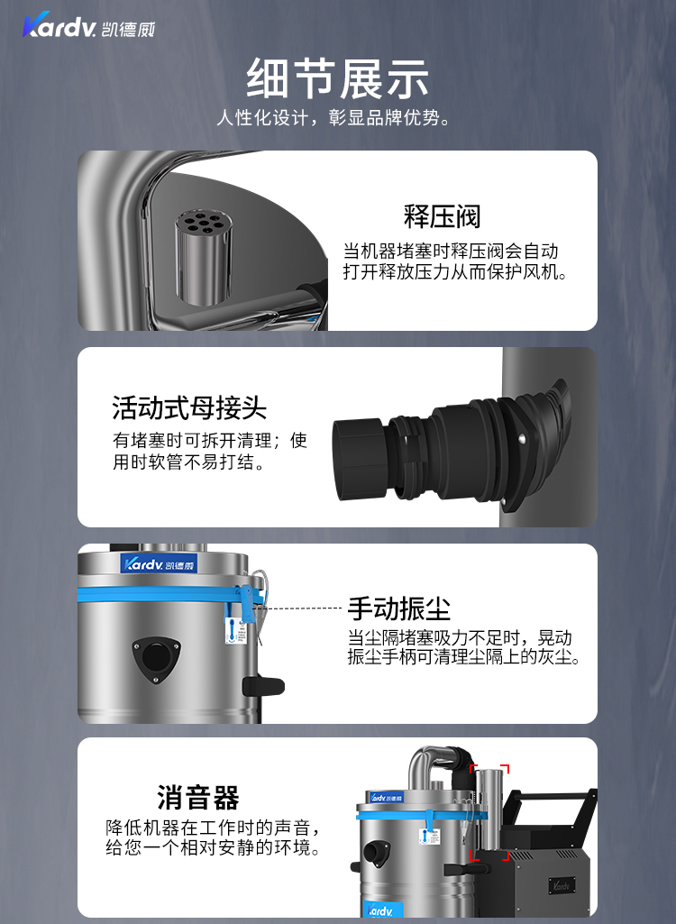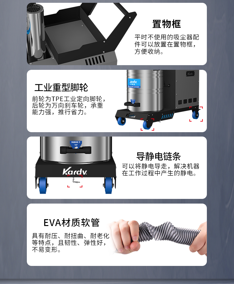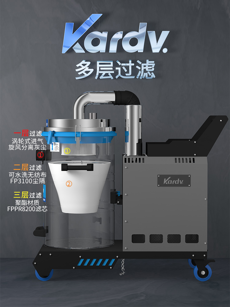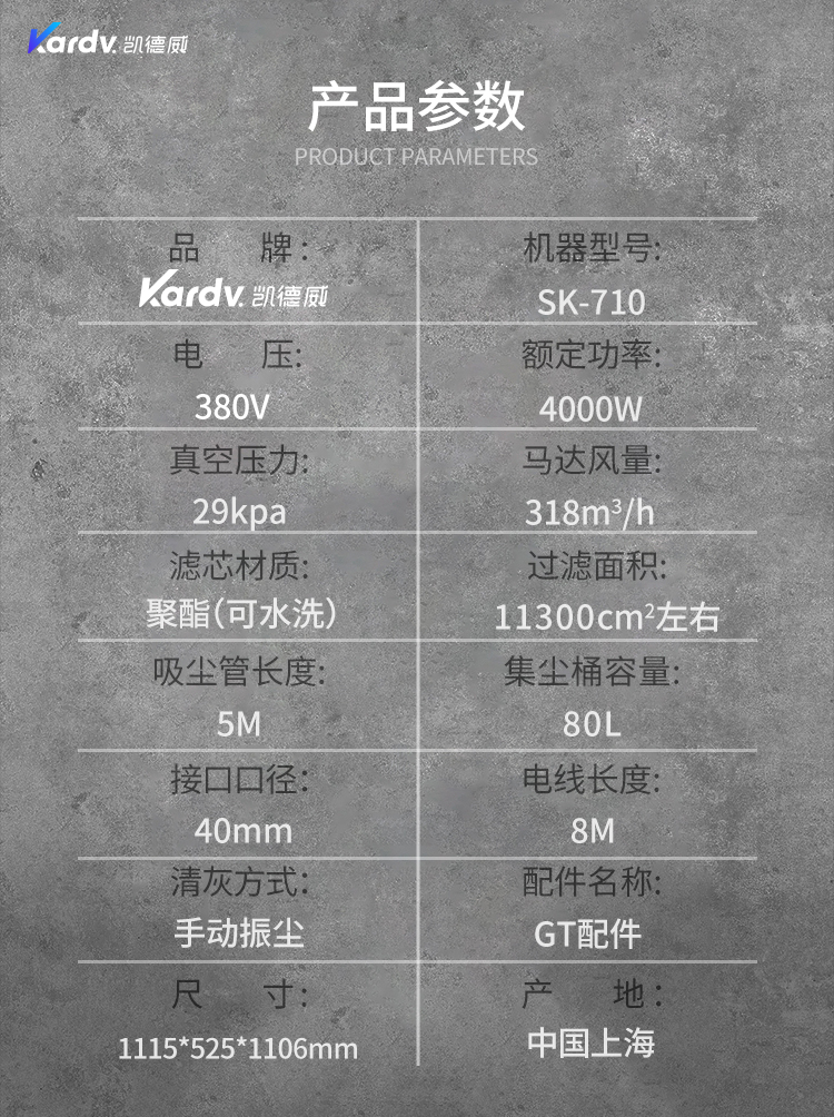 SK-710是一款自主研發的工業吸塵器。采用工業設計風格,做工精美,外觀大氣,黑灰色調搭配彰顯本機的工業風格。電控系統采用簡單易操作的按鍵式控制系統,有防缺相,漏電,過載的保護。動力源采用凱德威FY4.0定制主機,葉片以及外殼為合金材料壓鑄成型,再經過整體拋光噴涂,相對控制了整機的熱脹冷縮,風量穩定,并選用了質量穩定的軸承。
