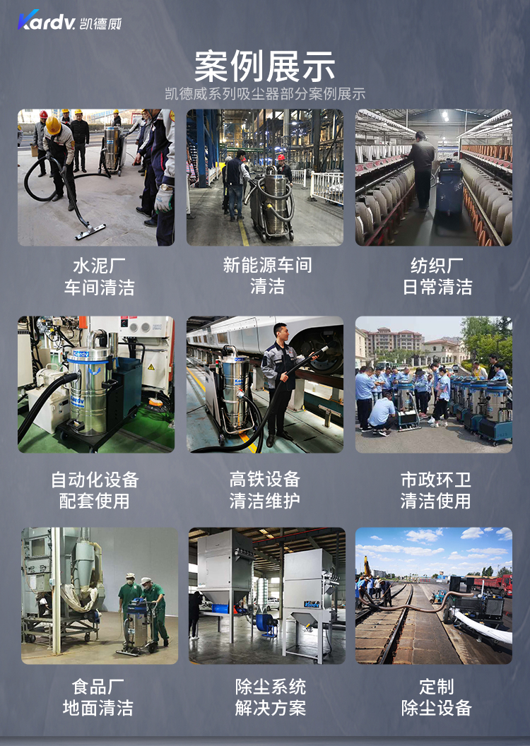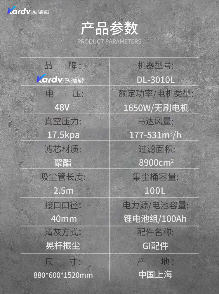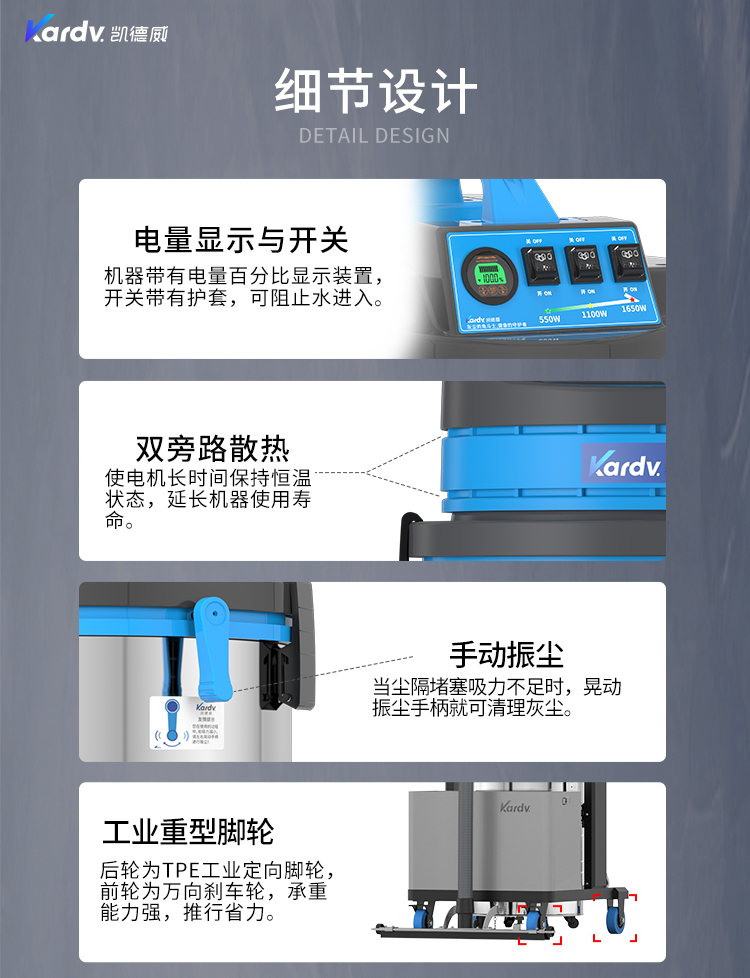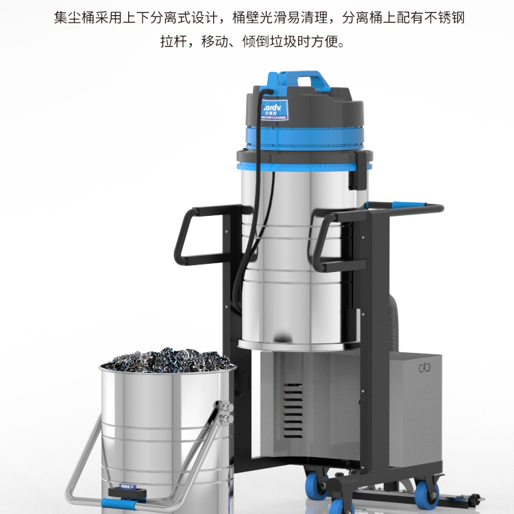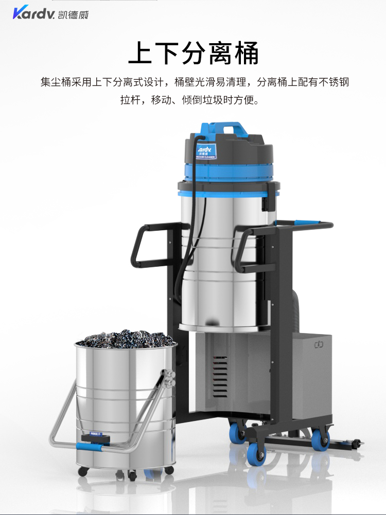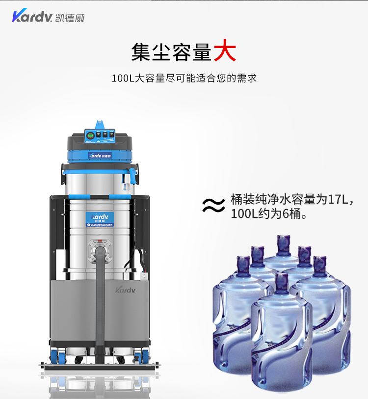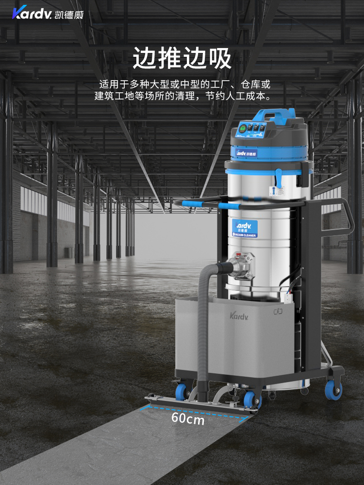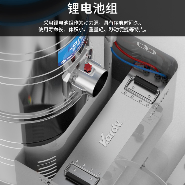 DL-3010L凱德威鋰電池吸塵器是我司的一款充電式工業(yè)吸塵器,摒棄了常規(guī)拖線式吸塵器使用范圍的局限性。此款吸塵器利用鋰電池組做為電力源,不需外接電源,操作簡(jiǎn)單方便。100L不銹鋼集塵桶采用上下分離式設(shè)計(jì),桶壁光滑易清理,分離桶上配有不銹鋼拉桿,移動(dòng)、傾倒垃圾時(shí)方便,移動(dòng)便捷,續(xù)航時(shí)間久,隨充隨用,簡(jiǎn)單方便。機(jī)器除常規(guī)手持式吸塵外,裝置有60cm寬可推吸扒頭,可以邊推邊吸,用于大面積地面除塵。