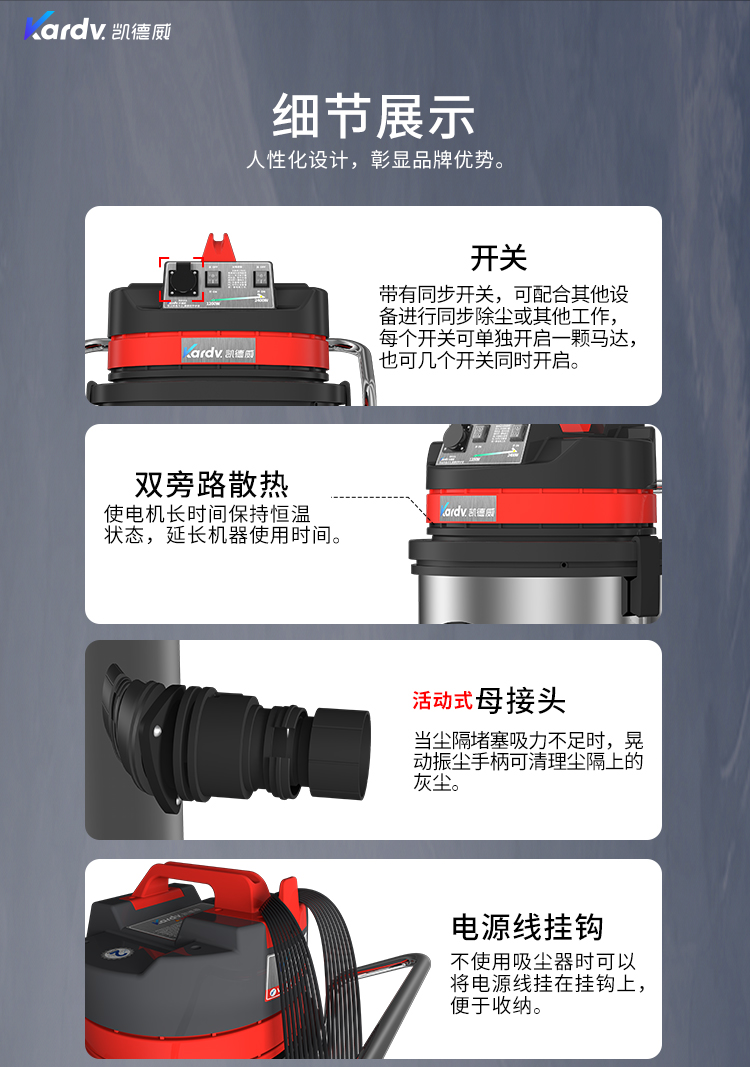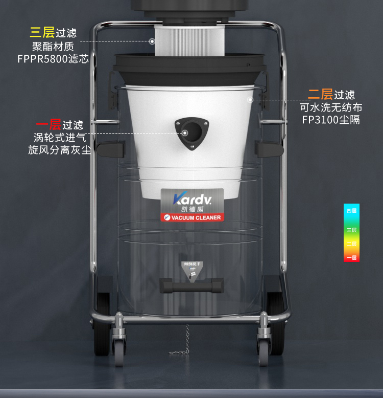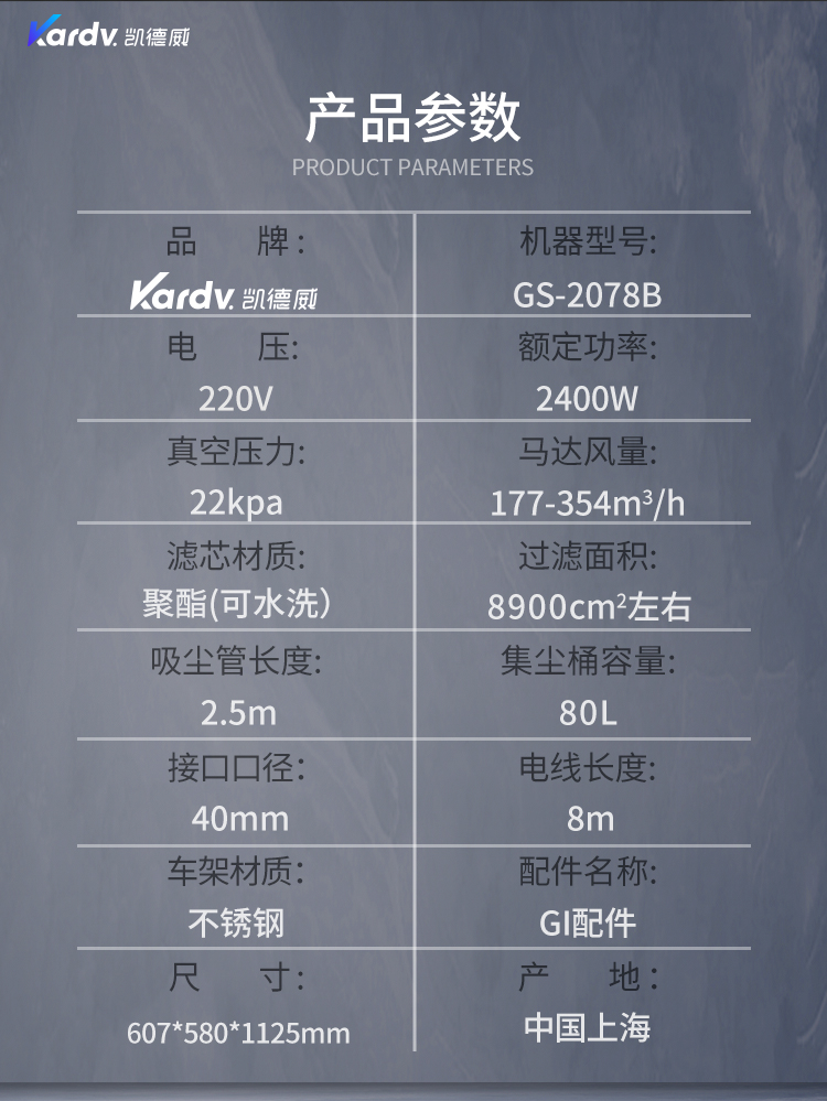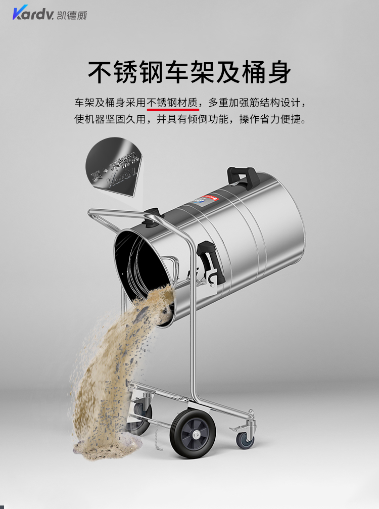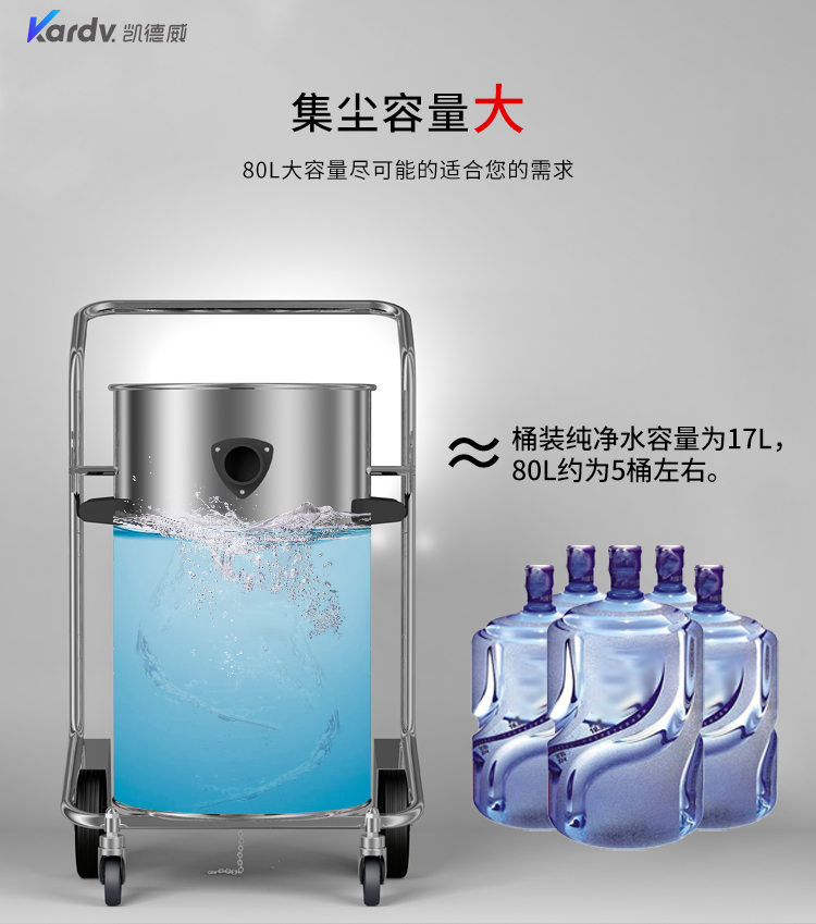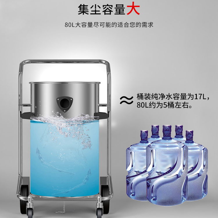 GS-2078B是一款工業型吸塵器,集塵桶為80L,為不銹鋼材質,配有不銹鋼車架,在移動時輕巧方便;可以用在工廠、倉庫或建筑工地等場所清理灰塵等,在商業環境中也可以使用。