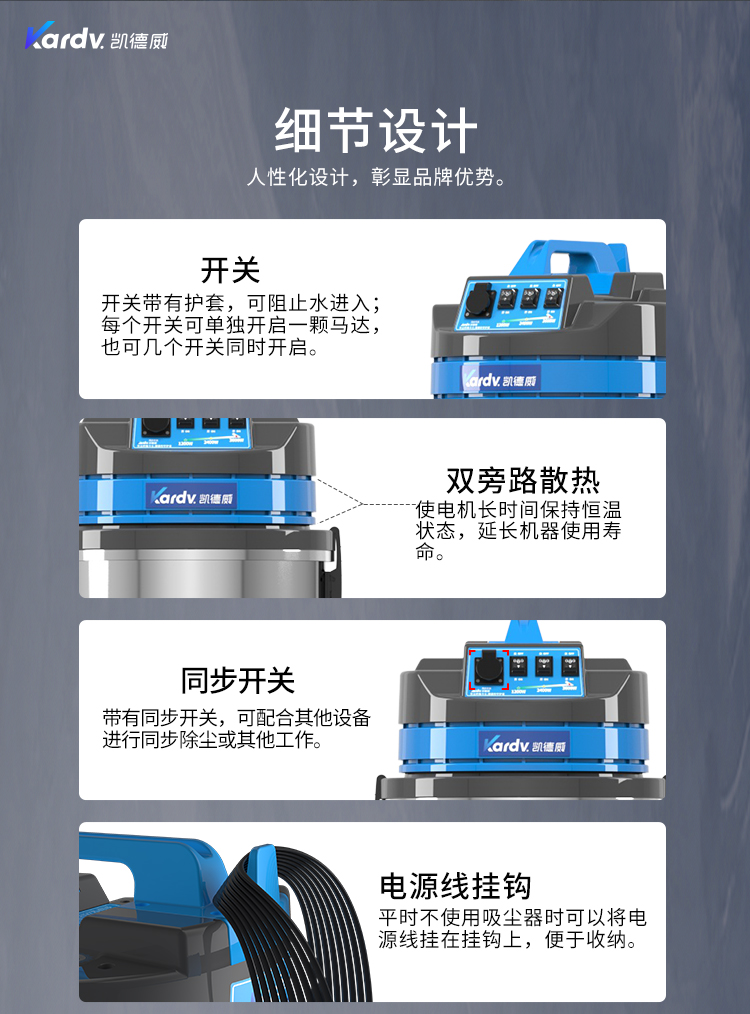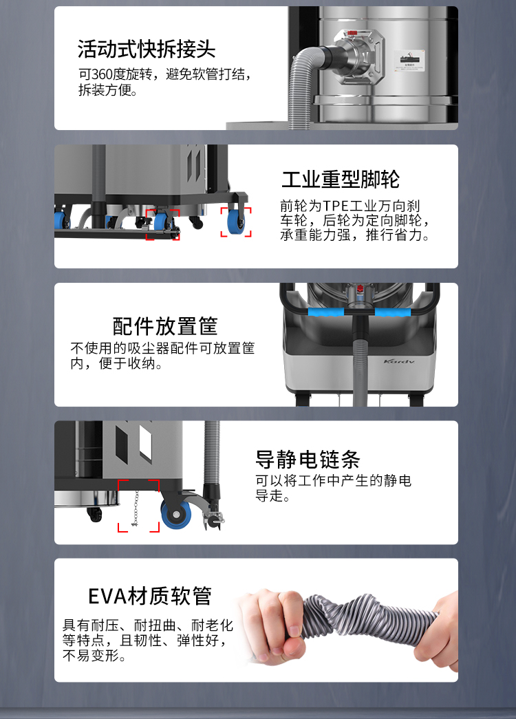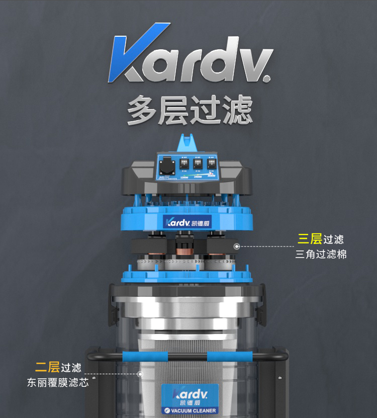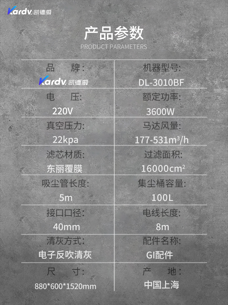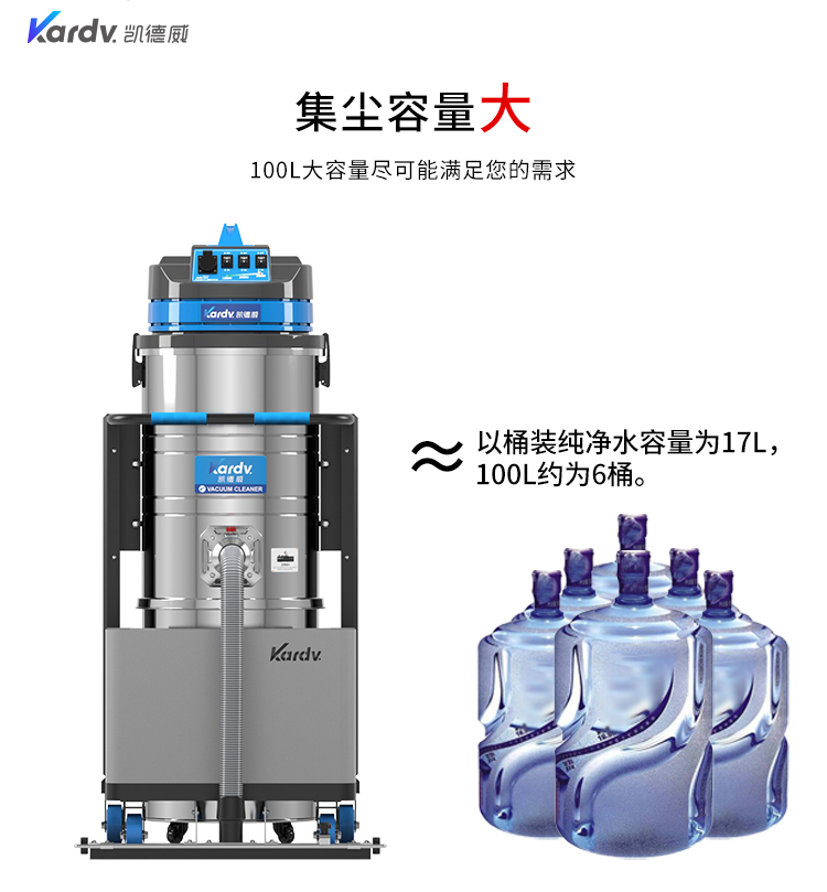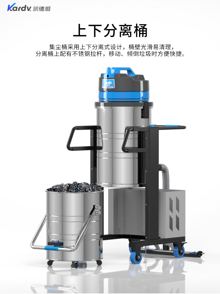 DL-3010BF是一款干濕兩用型工商業吸塵器,電壓220v,有3顆馬達組成,每個馬達1200w功率,合計功率360W,帶一套40口徑GI配件和一套60公分寬的推吸扒頭,工作直徑32米左右。可根據不同工況選擇單獨開一個電機或兩個/三個同時開,100L不銹鋼集塵桶采用上下分離式設計,桶壁光滑易清理,分離桶上配有不銹鋼拉桿,移動、傾倒垃圾時方便;配有反吹清灰裝置,當吸力不足時,可按下反吹手柄幾秒進行反吹清理。機器配有置物框,便于收納配件。機器可以邊推邊吸。適用于五金、食品、電機、機械、化工等工商