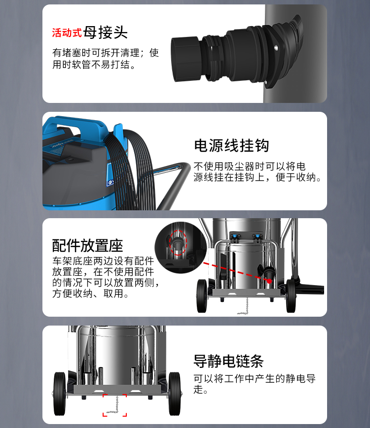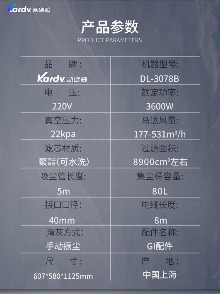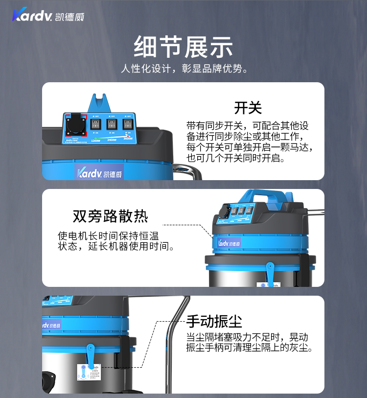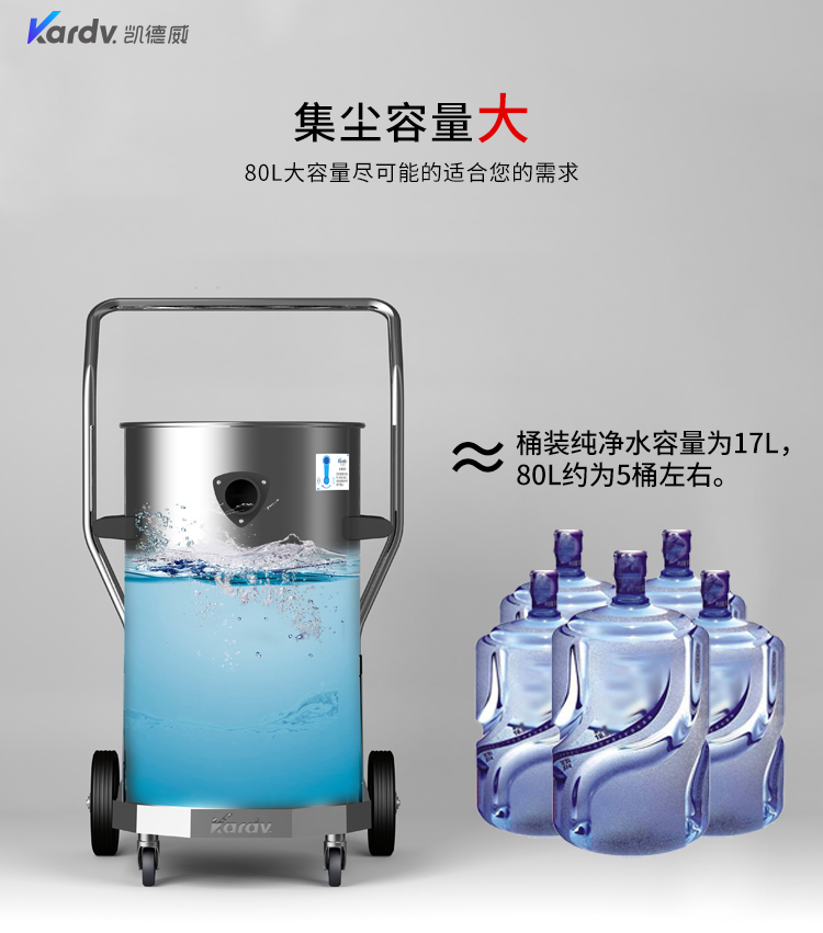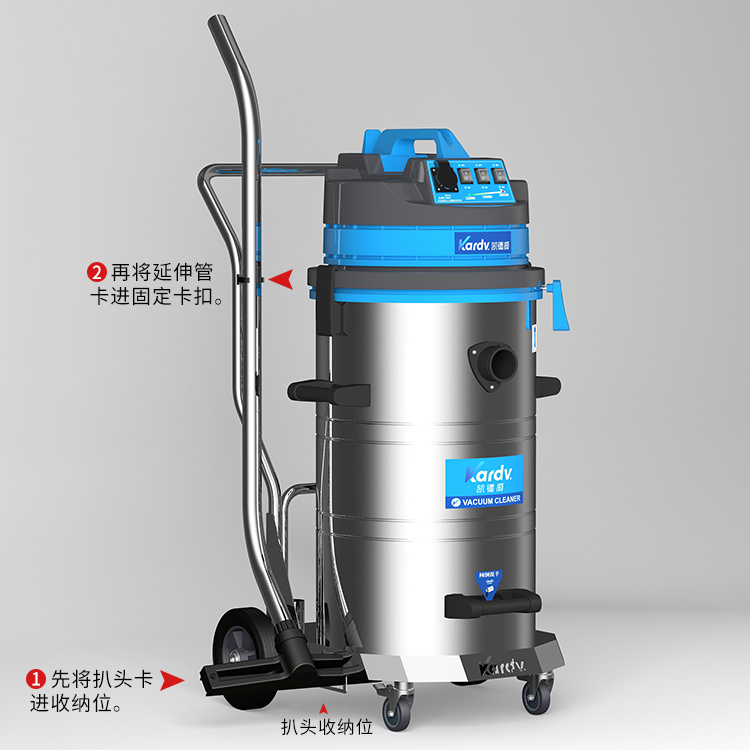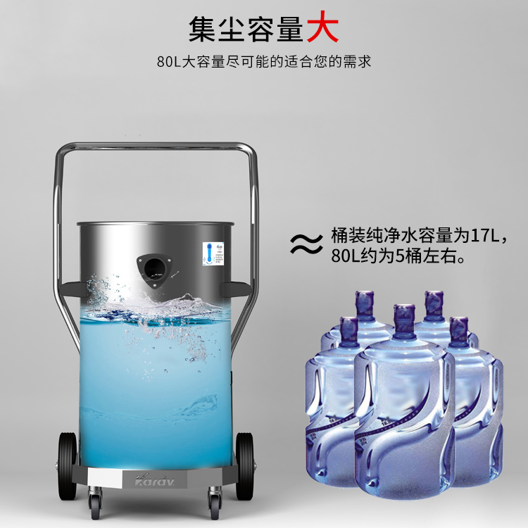 DL-3078B是一款工商業吸塵器,有3顆馬達,可單獨或聯合開啟;集塵桶為80L,為不銹鋼材質,配有不銹鋼車架,在移動時輕巧方便;配有手動晃動振塵,在使用的過程中,左右晃動振塵手柄就可以起到清理過濾器的作用;可以用在工廠、倉庫等場所清理灰塵等,在商業環境中也可以使用。