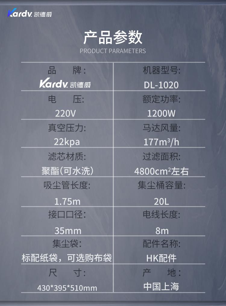 DL-1020是一款干濕兩用型吸塵器,集塵桶為20L;散熱上采用上下氣道分離設計;配有置物架,可以防止工具和配件,方便使用;可以用在倉庫、廠房等;也可與其它產品配套使用,也可用作將廢料收集;也可使用在普通的商業、企業環境,比如一般的辦公室、客房等。