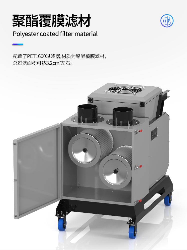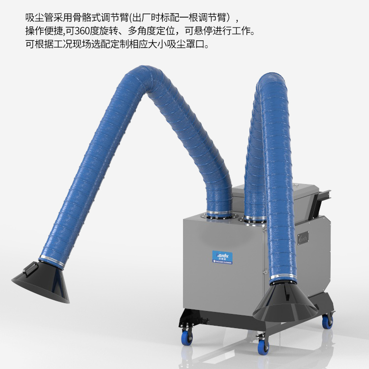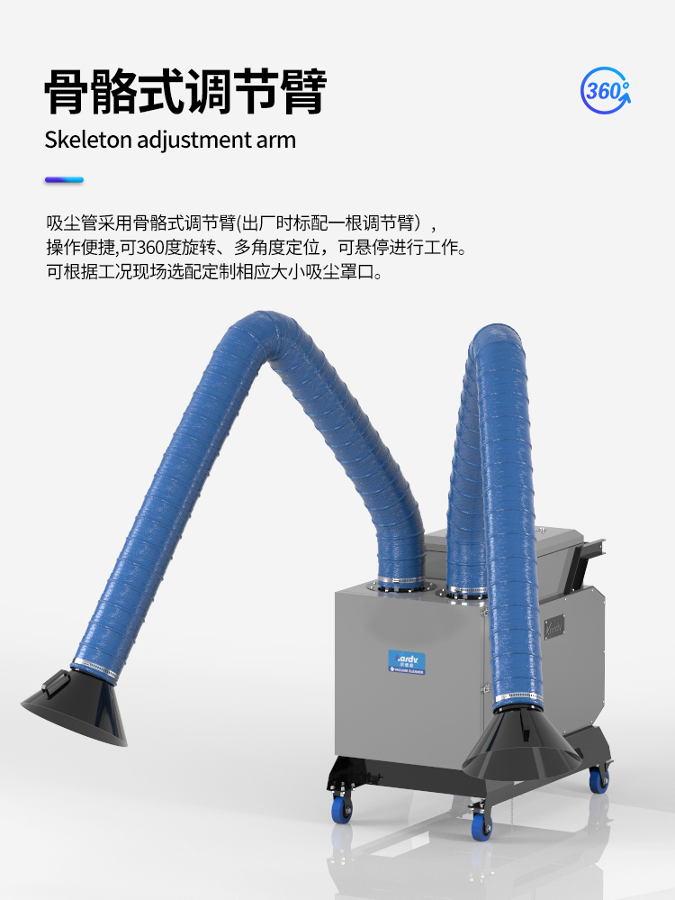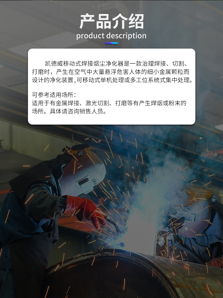 金屬焊接、激光切割、打磨作業(yè)時,大量煙塵懸浮在車間內(nèi),被吸入人體肺部影響身體健康,因此在焊接煙塵進(jìn)入焊工呼吸區(qū)前把這些煙塵進(jìn)行凈化處理。凱德威移動式焊接煙塵凈化器是一款治理焊接、切割、打磨時,產(chǎn)生在空氣中大量懸浮危害人體的細(xì)小煙塵顆粒而設(shè)計的凈化裝置,可移動式單機(jī)處理或多工位系統(tǒng)集中式處理。配有1根2.5米長的吸氣臂,在不同的工作地點移動靈活,操作方便。