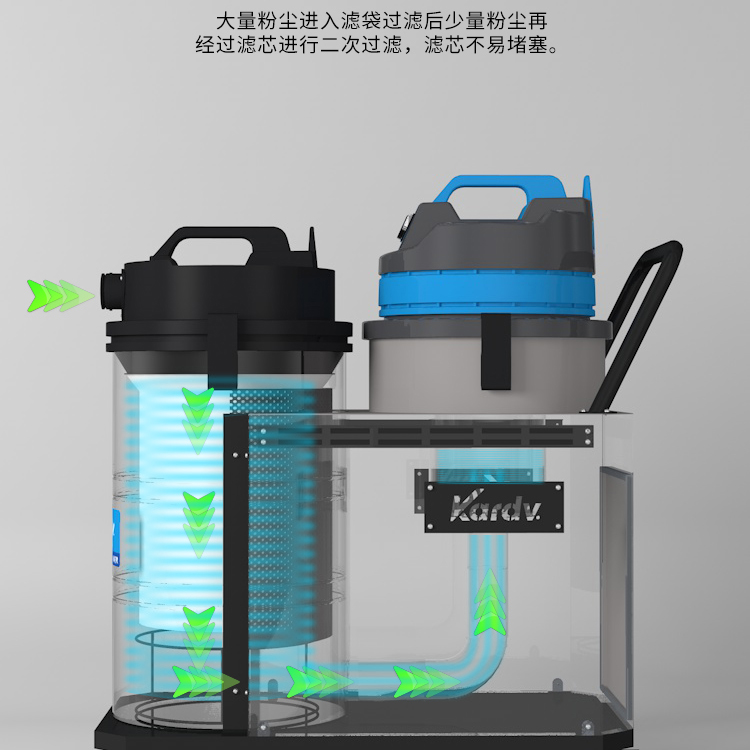 DL-3078X由我司設計,區別常規吸塵器的進氣方式,采用下進氣原理,在吸細小粉塵、紡織廠棉絮、棉絲等容易堵塞過濾器的垃圾時,使大部分垃圾直接進入布袋過濾,少量物質再經過濾器二次過濾,這樣解決了過濾器易堵塞的問題。